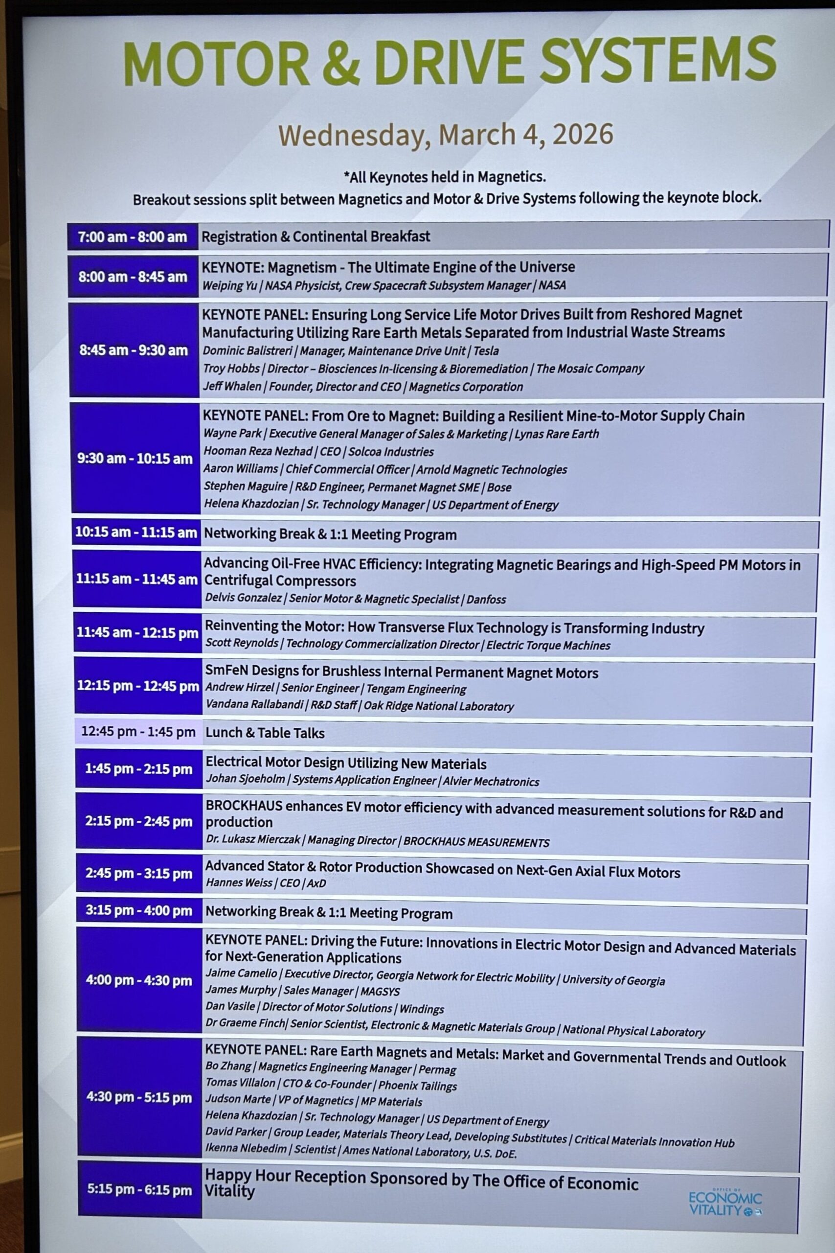 In 2025, China implemented strict export restrictions on “heavy” rare earth elements, including dysprosium. Dysprosium is an element that improves the performance of magnets made from rare earth materials. Bodine Electric’s brushless DC motors have rare earth magnets in them, but we no longer use dysprosium. So, the restrictions by China have no immediate impact on Bodine Electric. Still, it is good to keep up with what’s going on in the industry and that is why Auchstetter attended the conference. These are some of the things the attendees learned about: